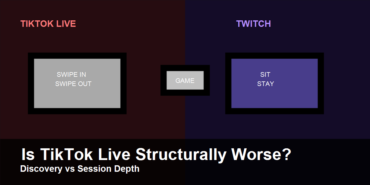 TikTok Live is not structurally worse across the board. It is structurally worse for certain types of games and viewing habits. If your game depends on deep focus, steady chat pacing, and repeat sessions, Twitch aligns better. If your goal is rapid discovery and clip-driven growth, TikTok can outperform. Decide based on session depth, not hype.